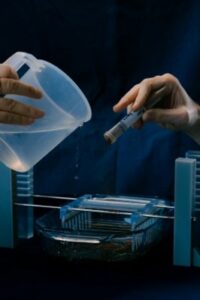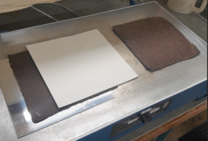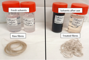 This process is based on the use of two different DES (solvent 1 and solvent 2 in the photo) used one after the other to treat the fibres. The solvents (especially solvent 1) are rich in extracted coloured components.