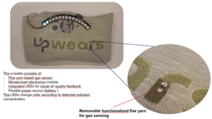 The e-textile consists of a flax yarn-based gas sensor combined with a miniaturized electronics module. It also integrates LEDs that provide visual air quality feedback, as well as a flexible power source (battery).